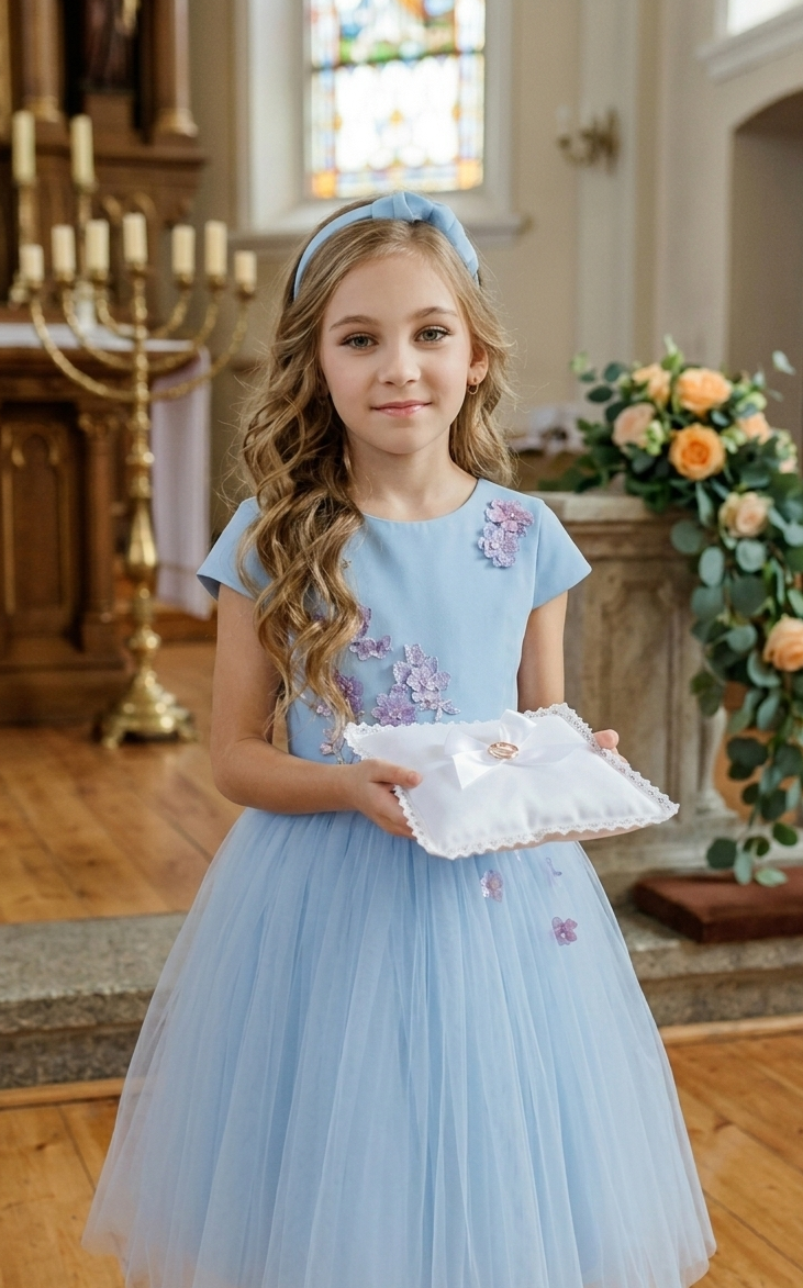 A beautiful, heavenly dress will decorate various holidays when girls want to become princesses, fairies. Puffy dress for girls with 2D hand-embroidered flowers, beads. 2D effect – when some petals of the flower are sewn to the fabric, while the others are raised from it, all this creates the image of unfolding flowers. With this outfit, the girl will feel the real celebration!