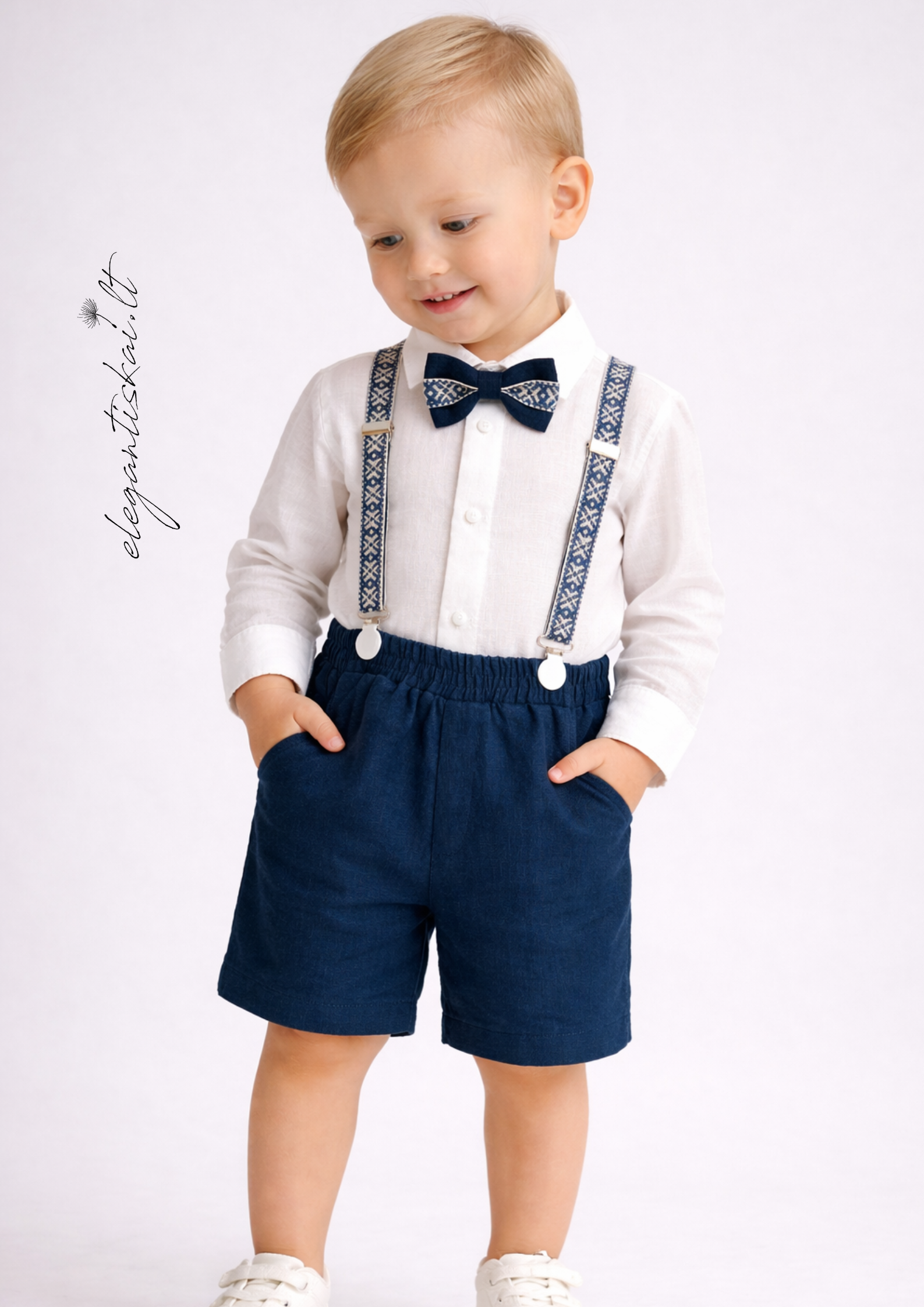 Natural linen suit for a boy, consisting of: white shirt, trousers and matching suspenders and bowtie. Party wear for a true gentleman!