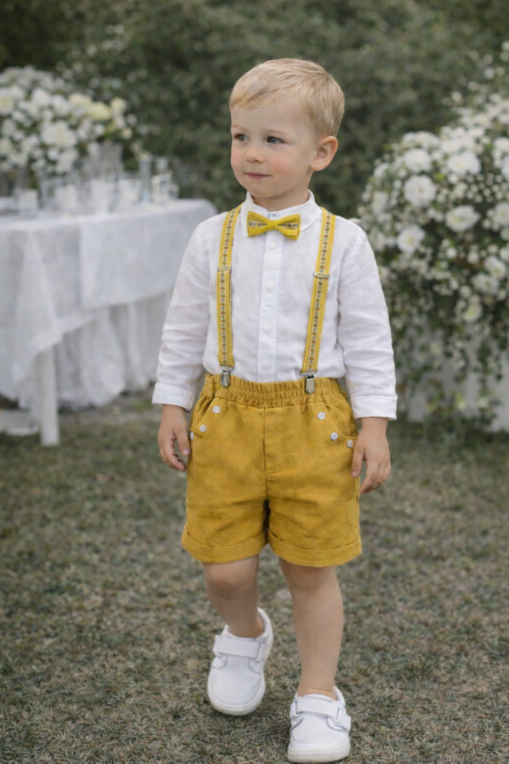 A natural linen suit for a boy, consisting of: a white shirt, trousers and matching suspenders decorated with an ethnic pattern and a bowtie. Party wear for a true gentleman!