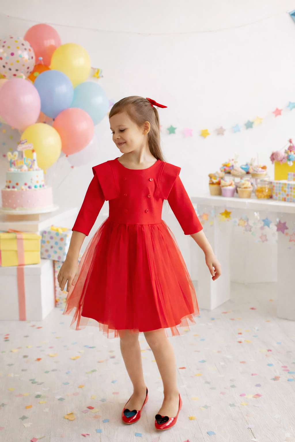 Red dress for a girl with fancy petticoats and a puffy skirt. Dress with 3/4 sleeves is suitable for any occasion, everyday and holidays. Fastens with a button at the back.