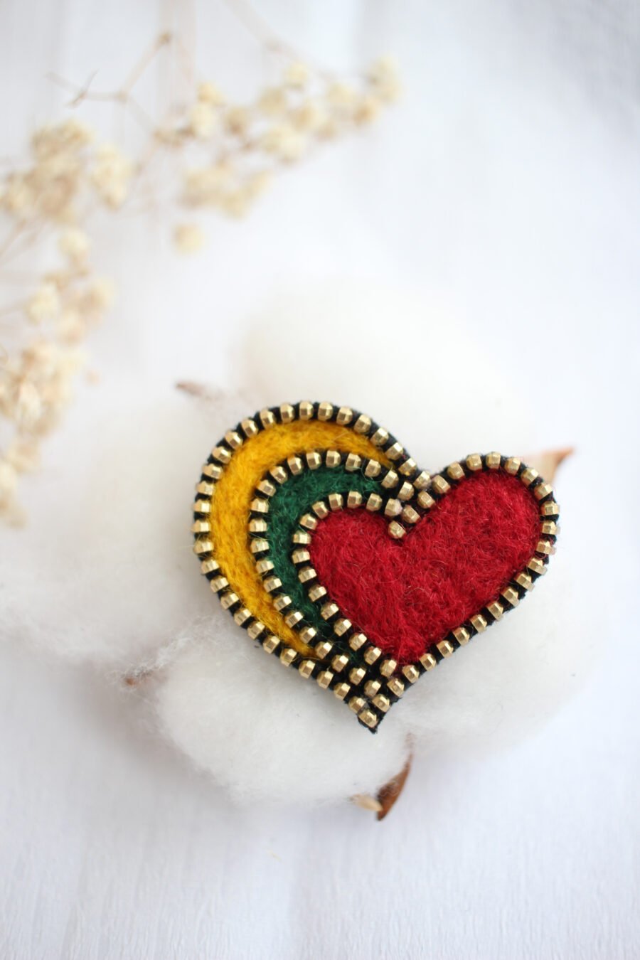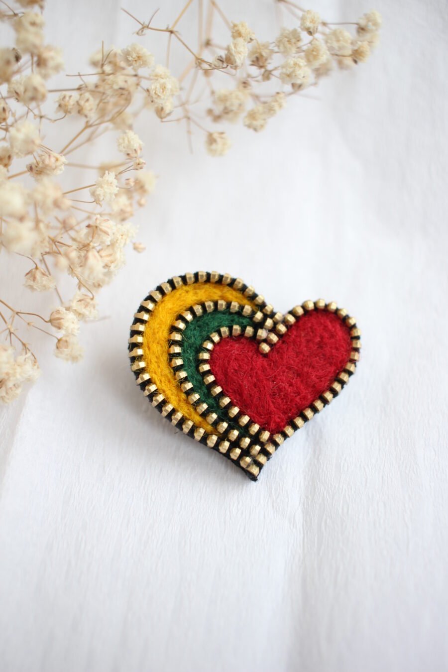 A handmade brooch symbolizes the Lithuanian tricolor, is a patriotic piece of jewelry for everyday life and special occasions. The brooch is made of a gold-colored metal zipper and three-colored wool, matching the colors of the Lithuanian flag. This is a handmade work of art, the birth of which requires a lot of time, diligence, effort and a lot of love.