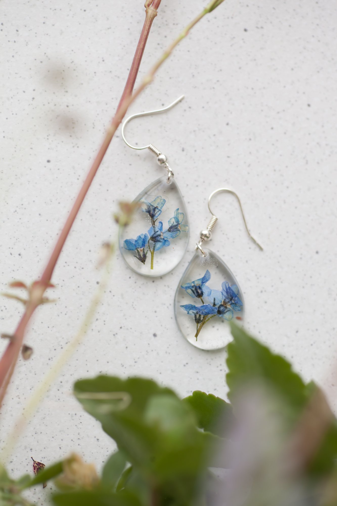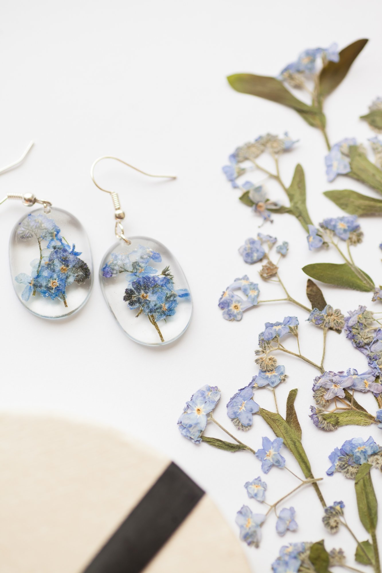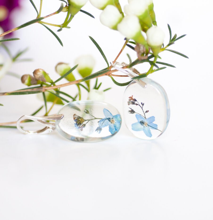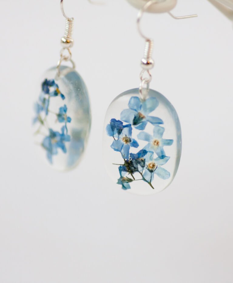 Artistic, handmade earrings with forget-me-nots cast in jewelry resin. Lightweight, dangling earrings made of silver are one-of-a-kind, because they use a different flower. Just as no two plants or flowers are the same, a woman wearing these earrings will reveal herself as a unique personality.