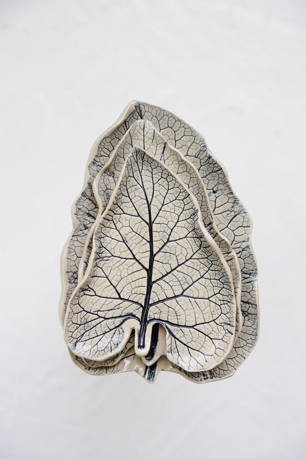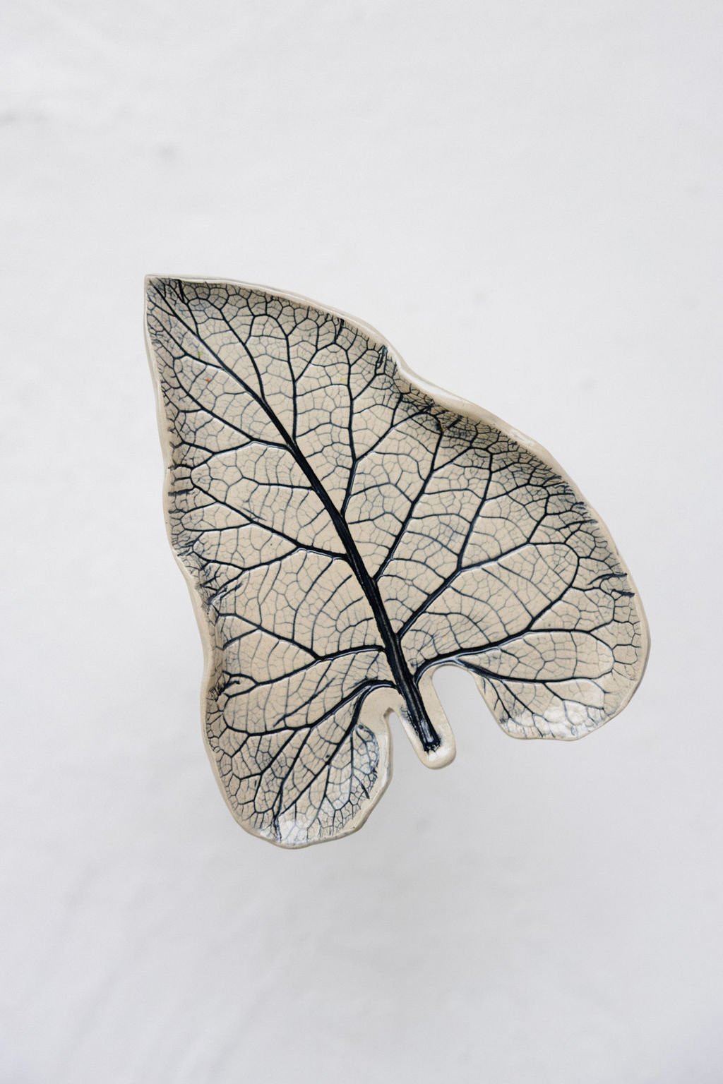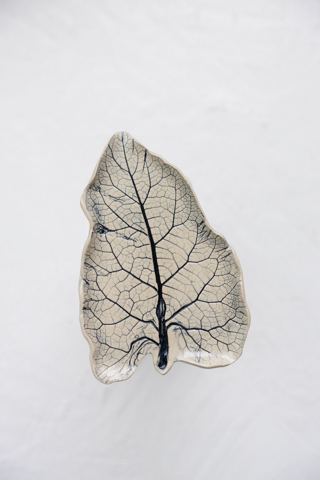 Handmade stoneware vessel, decorated with an original pattern, which was born by pressing a burdock leaf. A burdock leaf is a symbol of old age, an imperfect body, but a rich spirit. Large, strong, rough – like the face or hand of an ordinary person. At the same time, such a leaf is considered a sign of roughness, naturalness, unaestheticized nature.