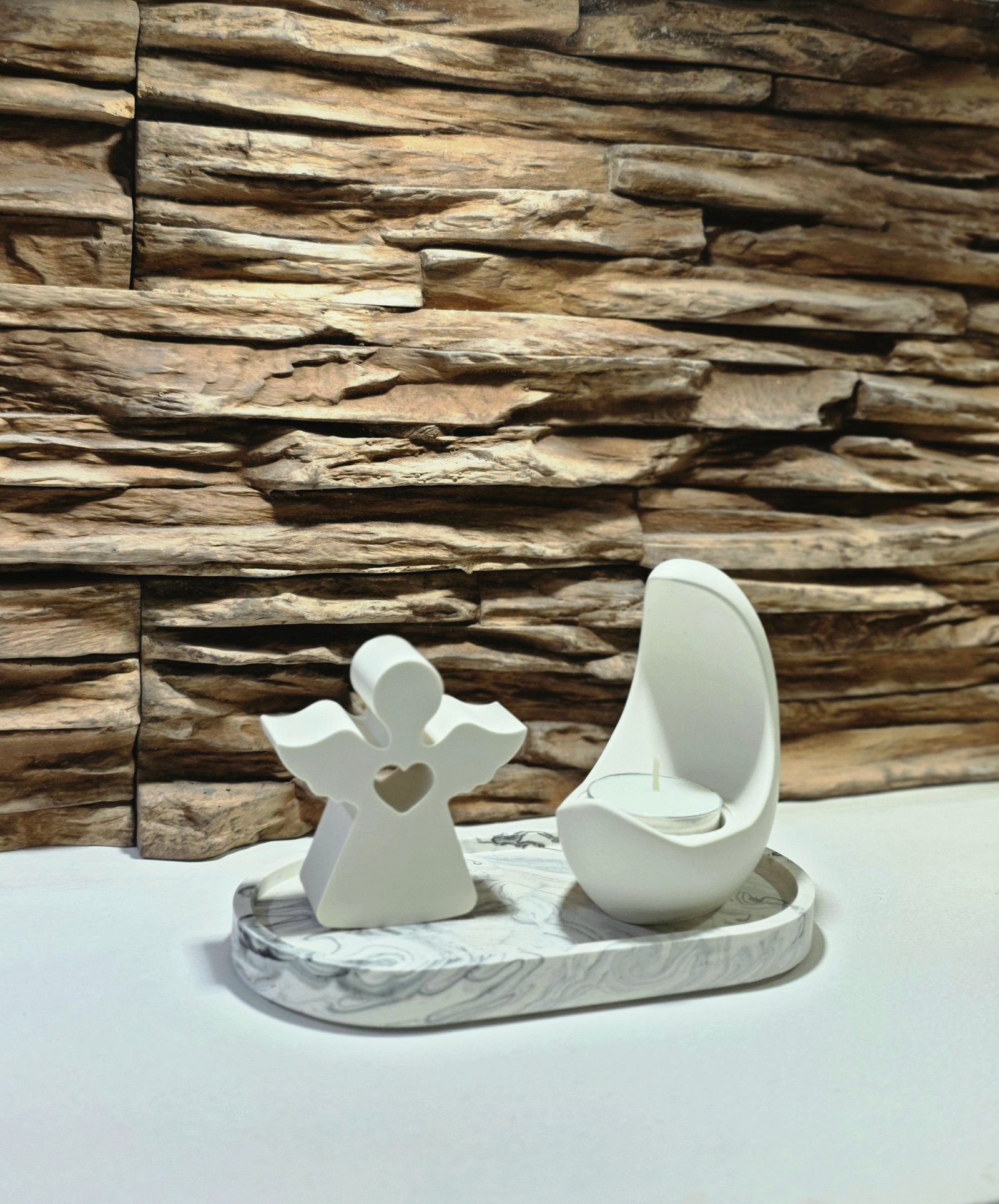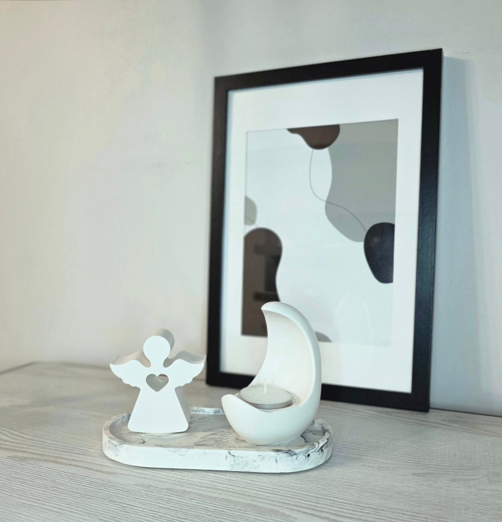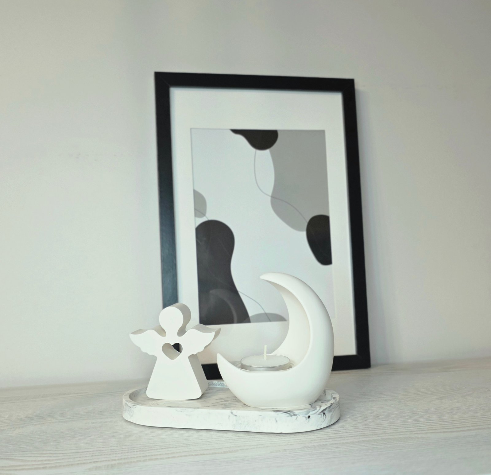 Handmade details for the interior: a tray, a moon-shaped candlestick and a standing decoration – an angel. The tray will protect furniture from shocks, moisture, and heat. The candlestick will give many romantic moments. And the angel statue will decorate the environment of any room or space.