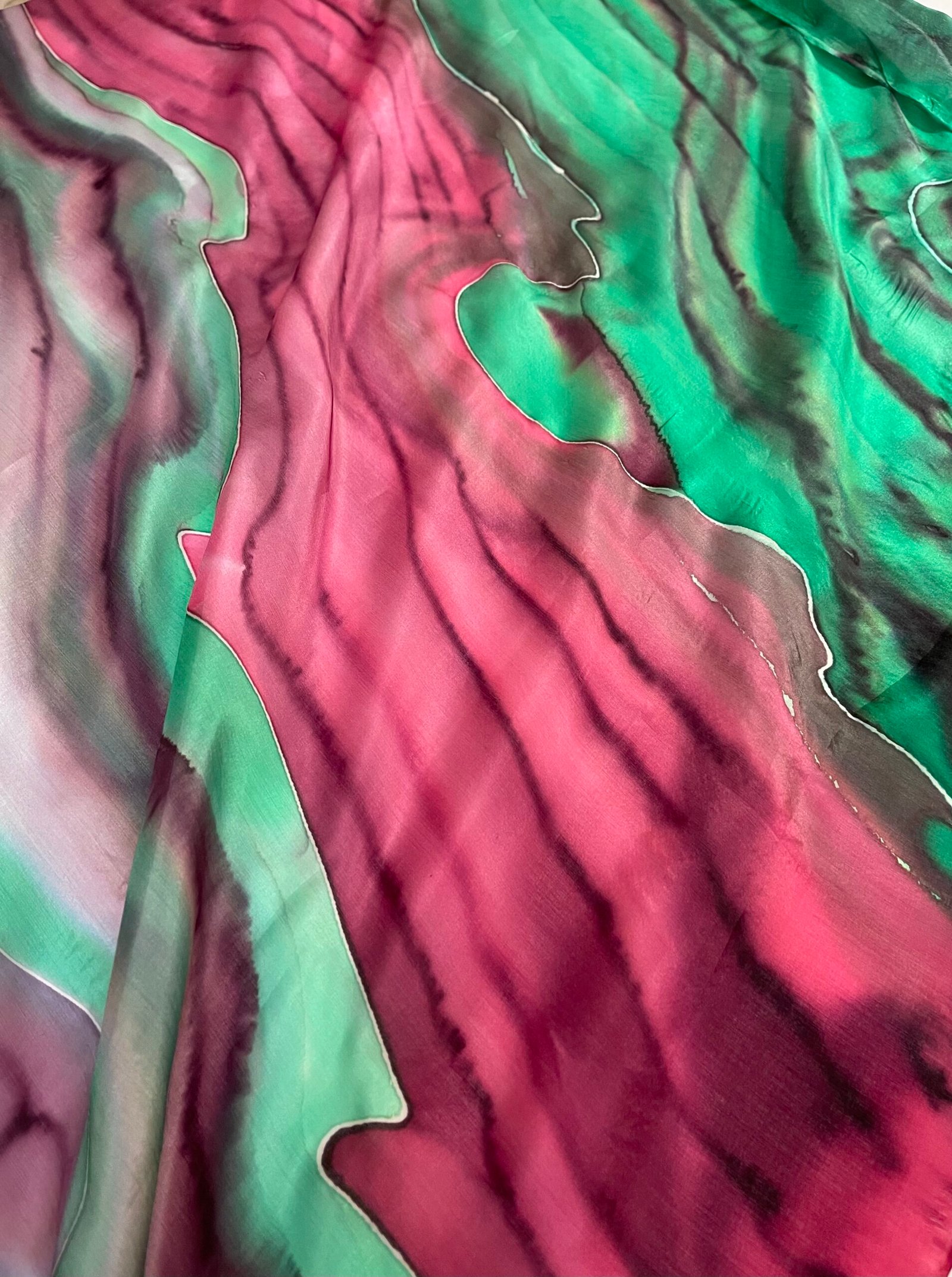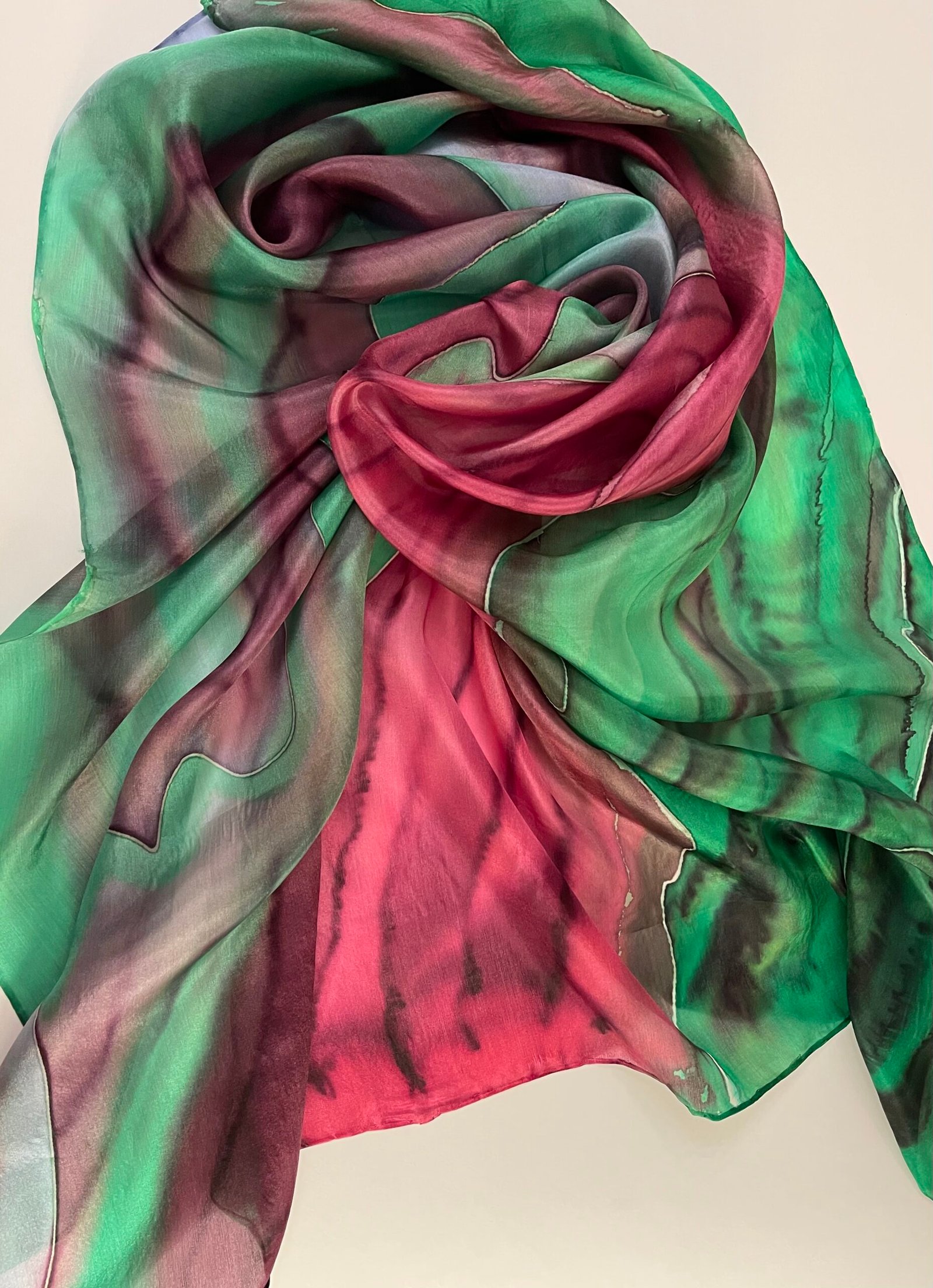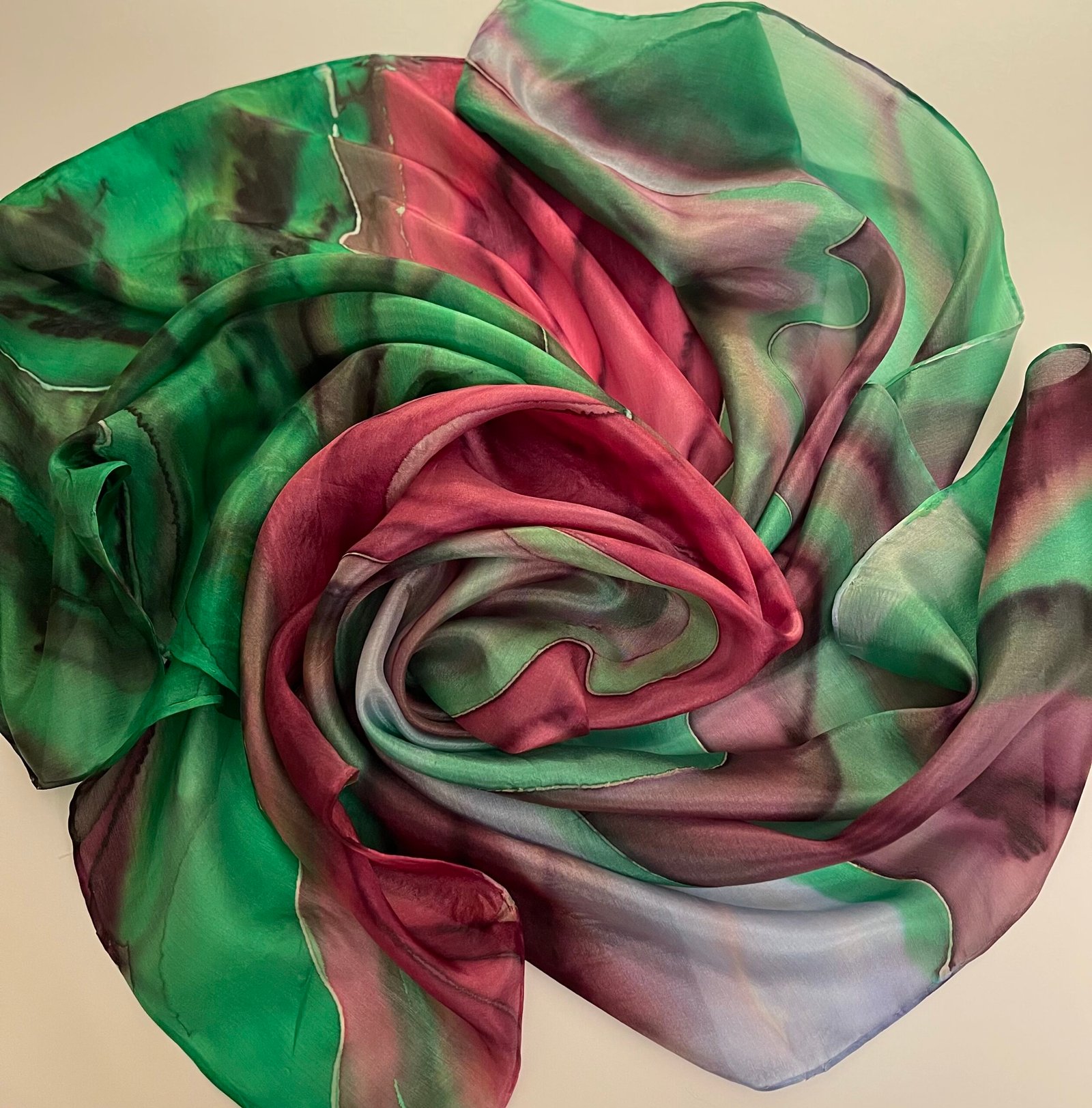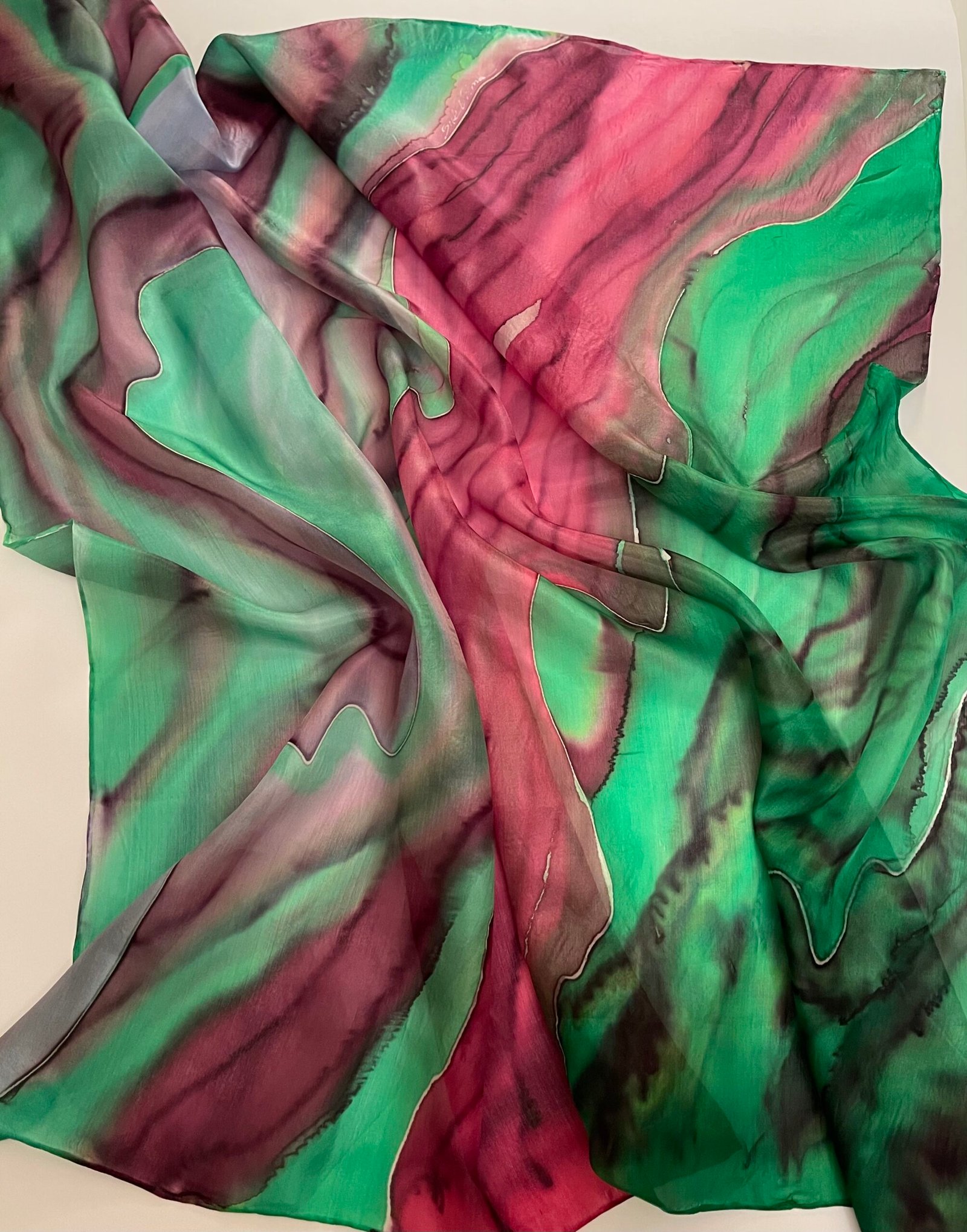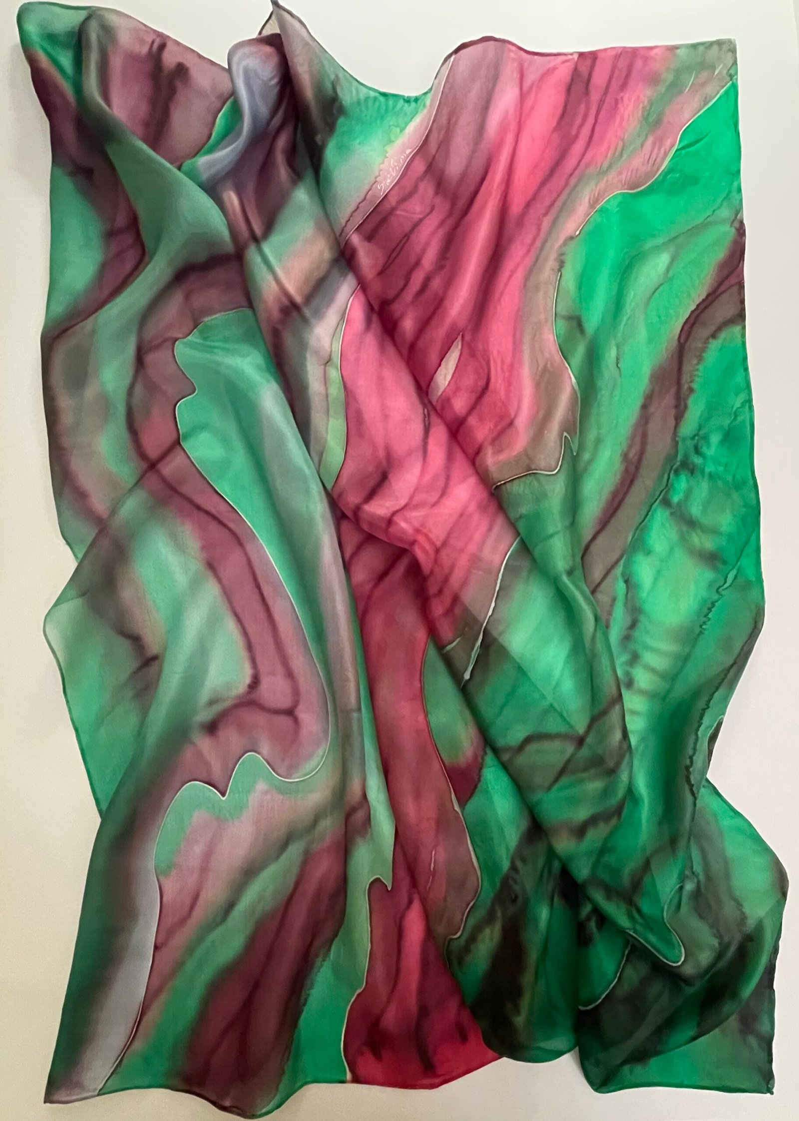 This unique, one-of-a-kind, handmade shawl is painted with natural plants and silk dyes.