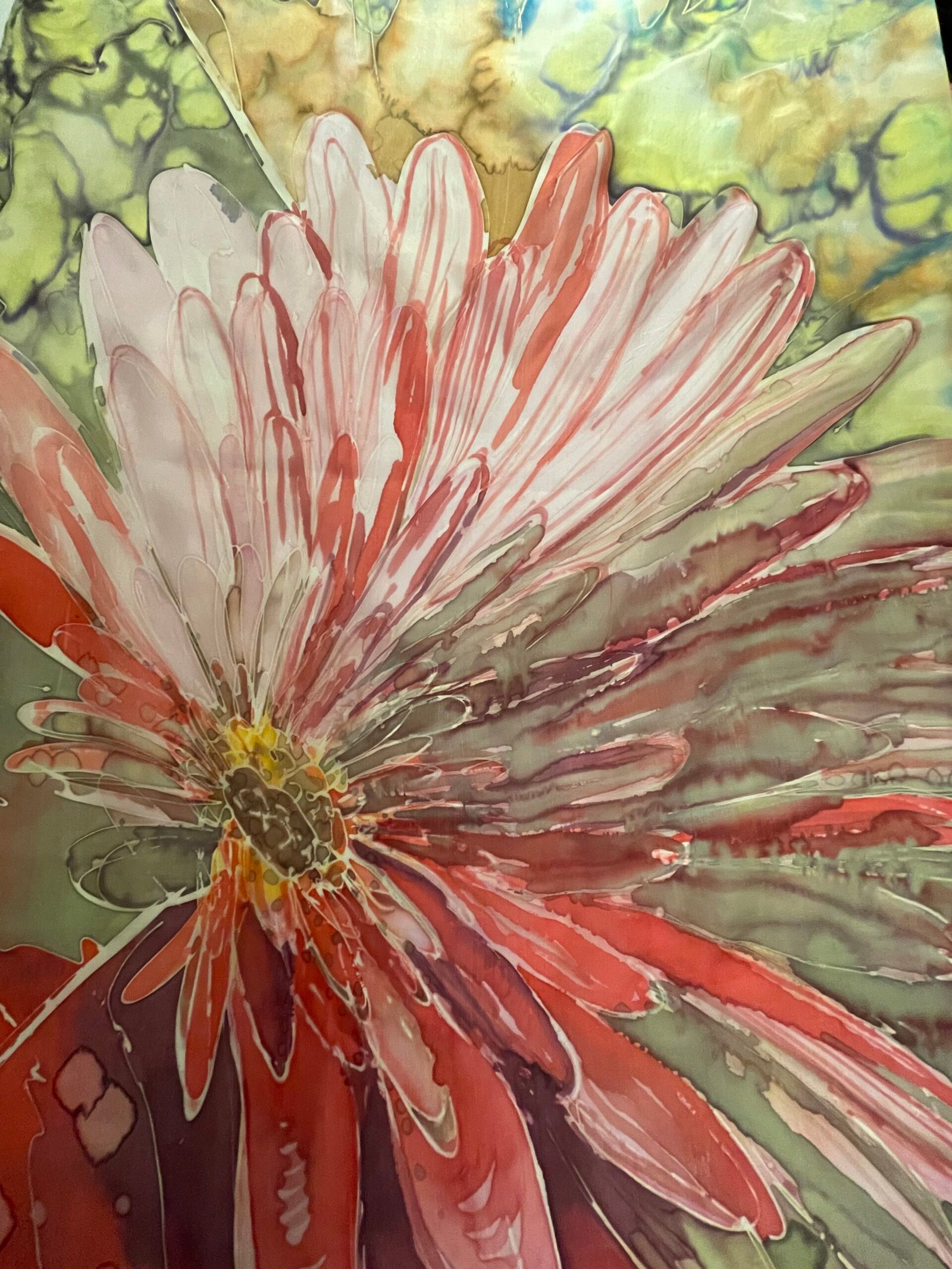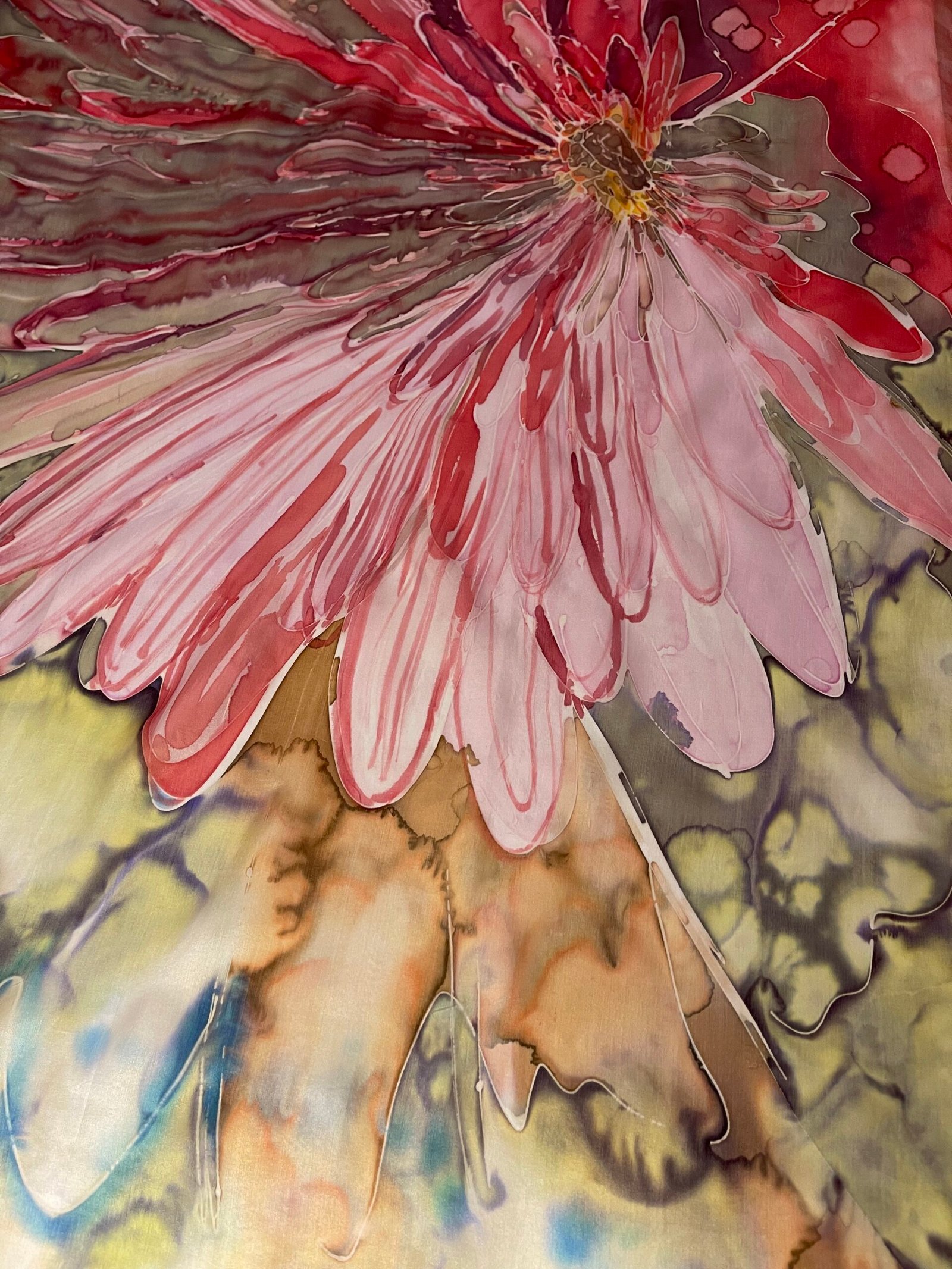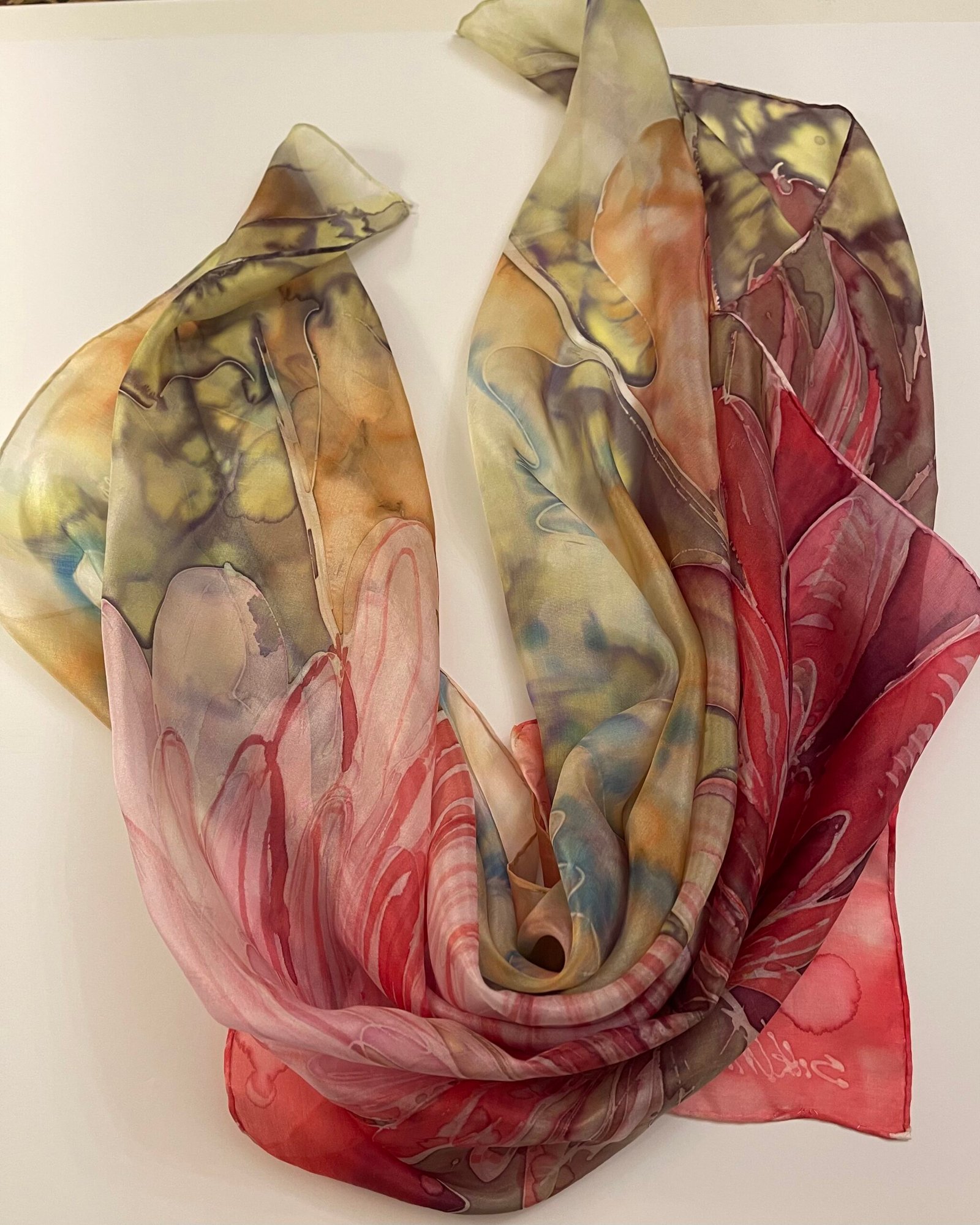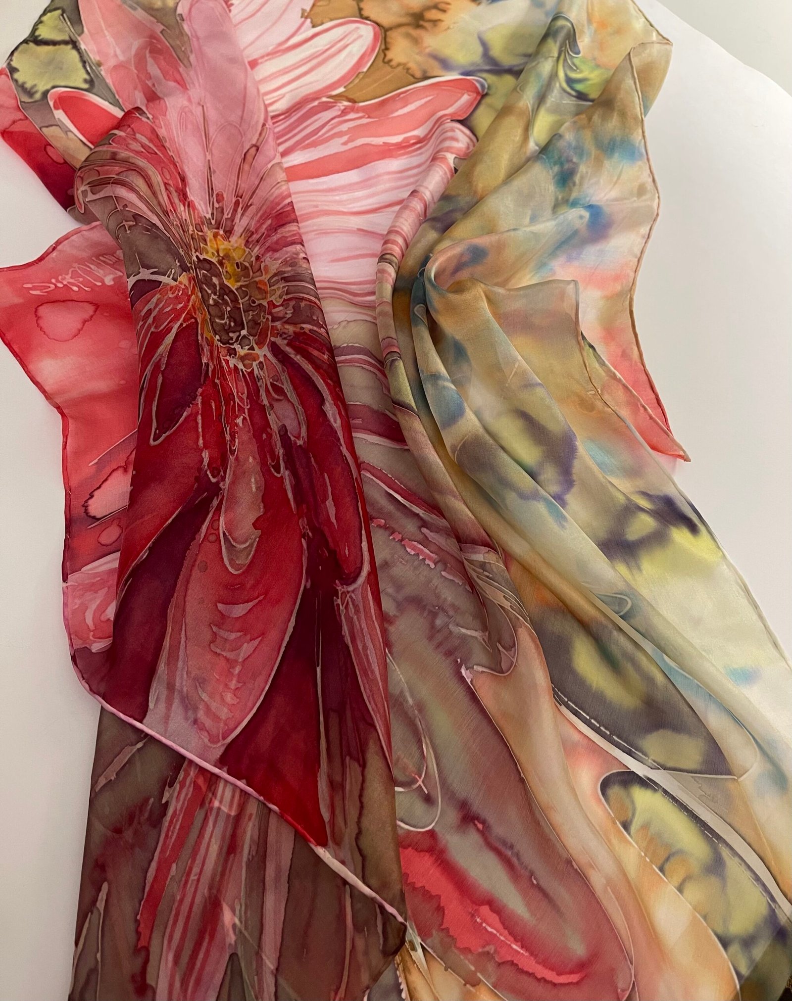This unique, one-of-a-kind, handmade shawl is painted with natural plants and silk dyes.