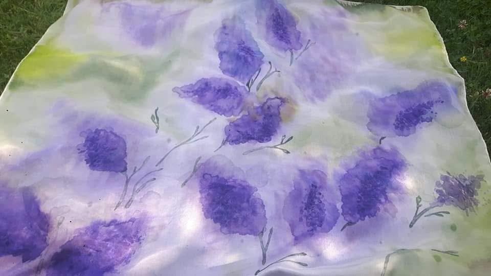 This unique, one-of-a-kind, handmade shawl is painted with natural plants and silk dyes.
