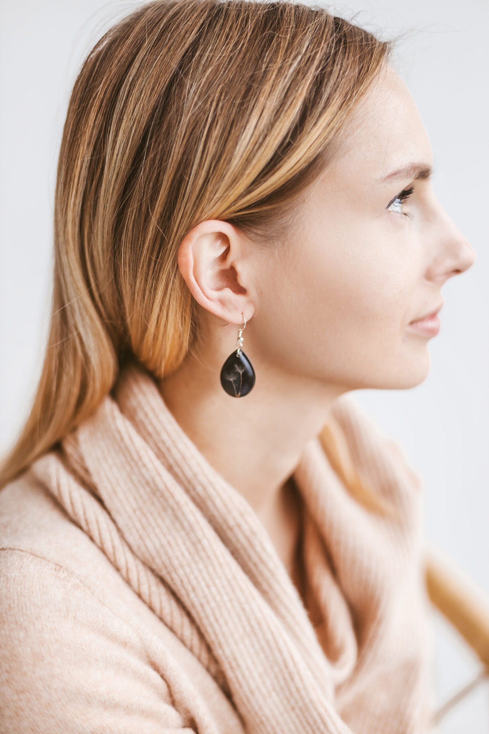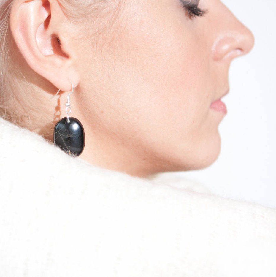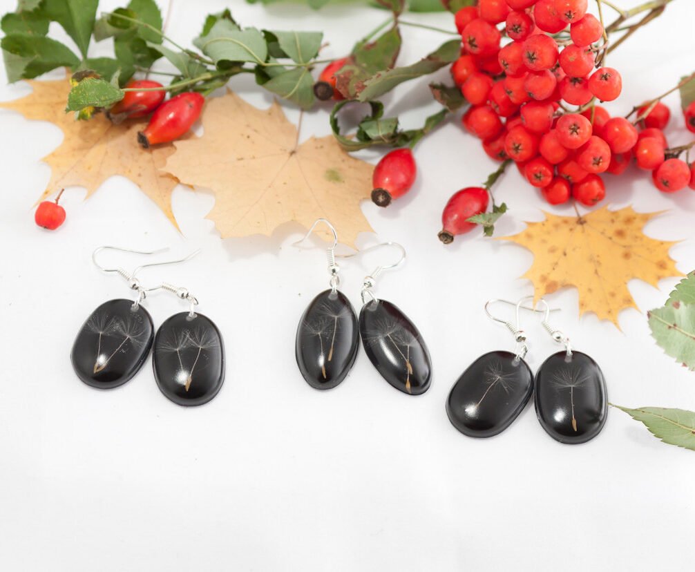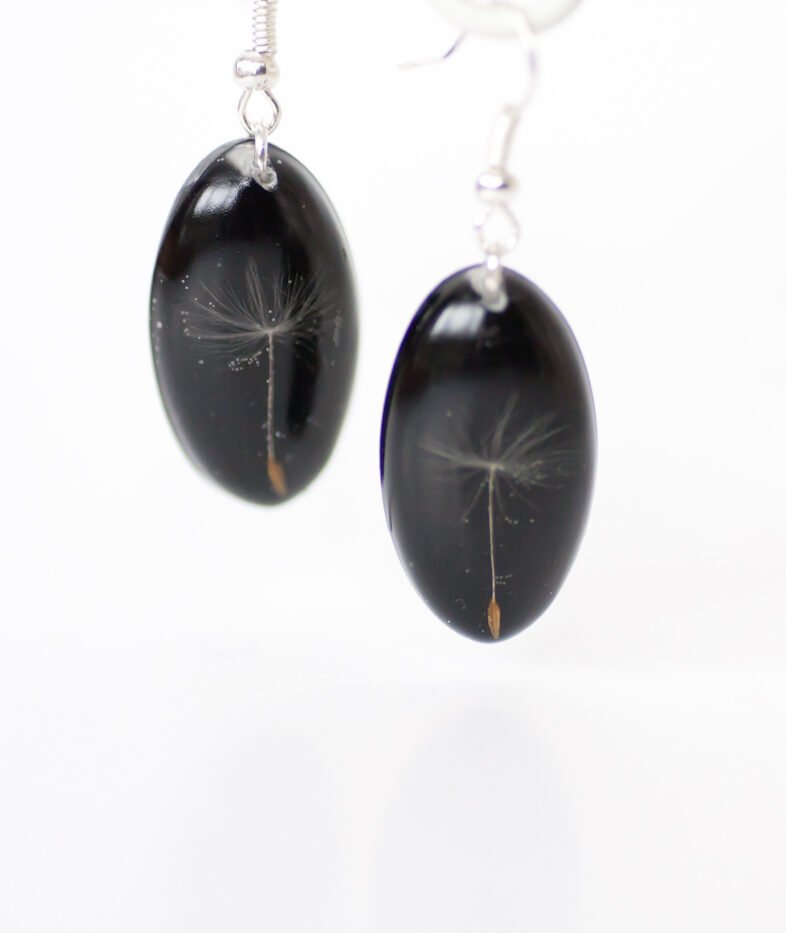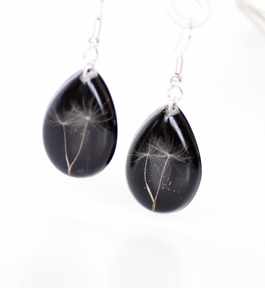 Artistic, handmade earrings with meadow plants cast in jewelry resin. Light, dangling silver earrings are unique because they use a different flower. Just as there are no identical plants or the same flower, so a woman wearing these earrings will reveal herself as a unique personality.