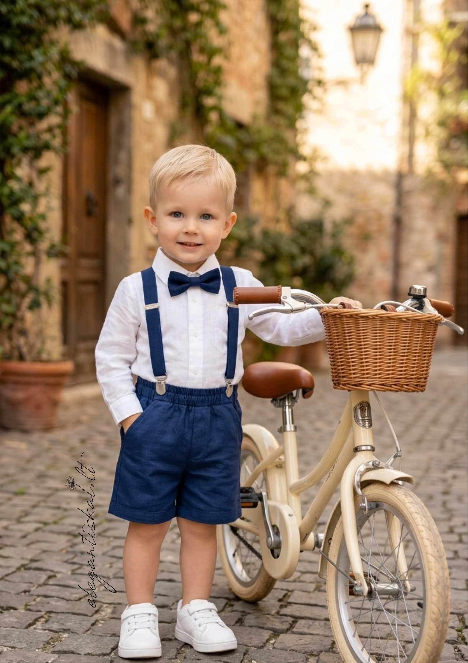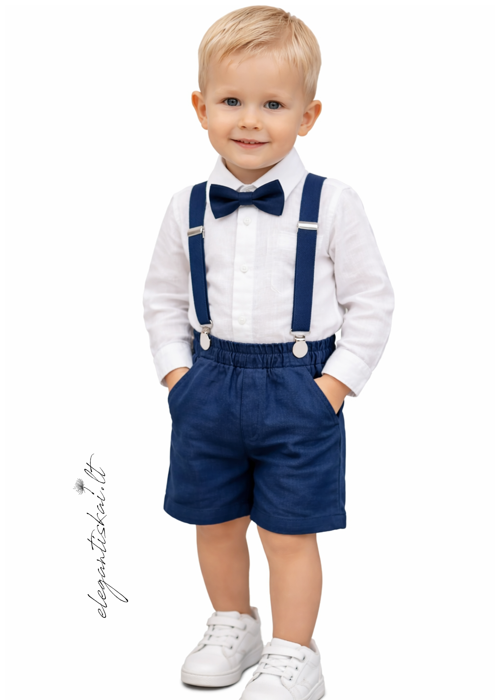 Natural linen suit for a boy, consisting of: white shirt, gray shorts and suspenders and bow tie decorated with a national pattern. Party wear for a true gentleman!