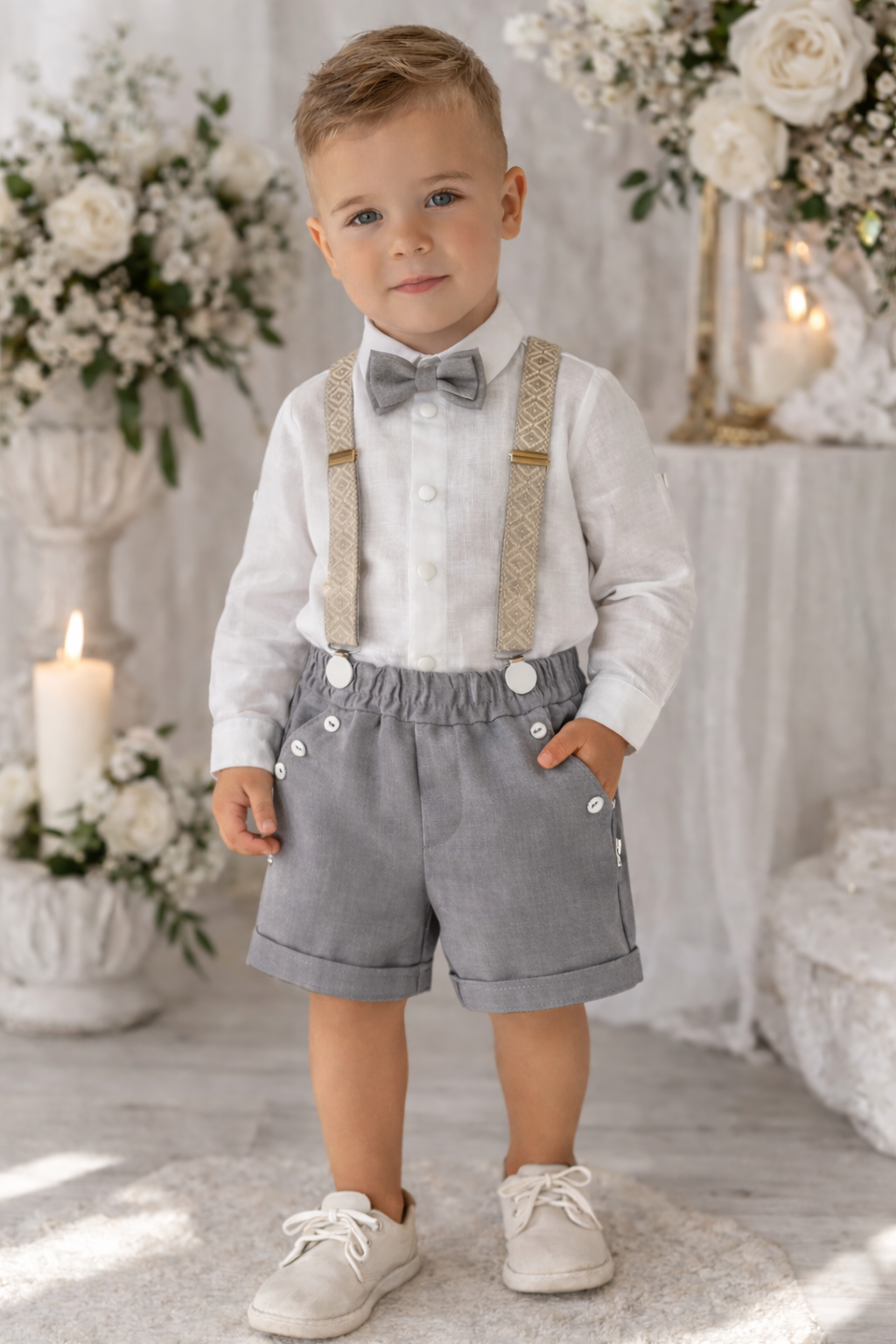 Natural linen suit for a boy, consisting of: white shirt, gray shorts and suspenders and bow tie decorated with a national pattern. Party wear for a true gentleman!